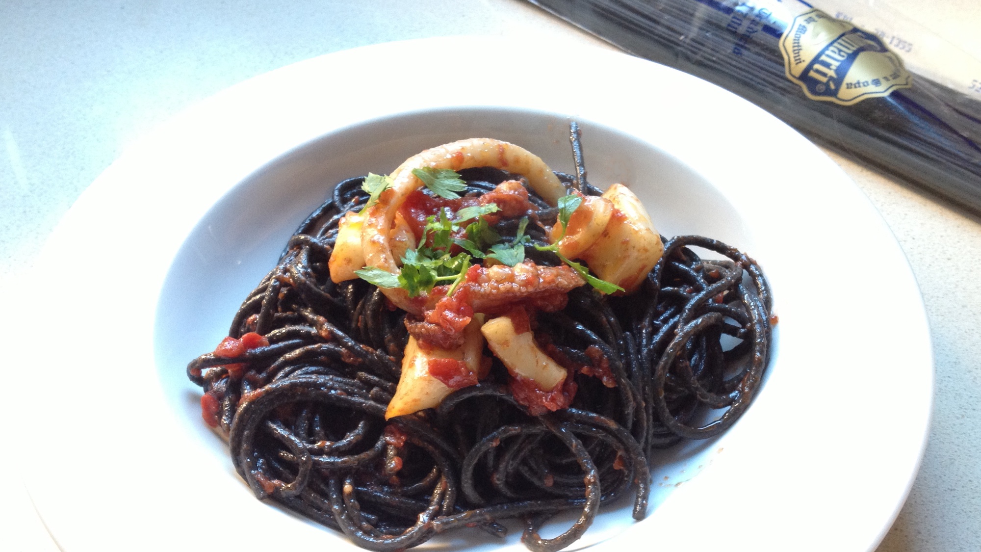 Espaguetis negres amb salsa de tomàquet i sípia (o calamar)