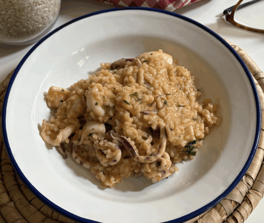 No paella! Ingredients (per a 4 persones) 300 g d’arròs 5 calamars petits 1 litre de fumet de peix (fet amb caps de gambes o similar) ½ ceba 1 got …