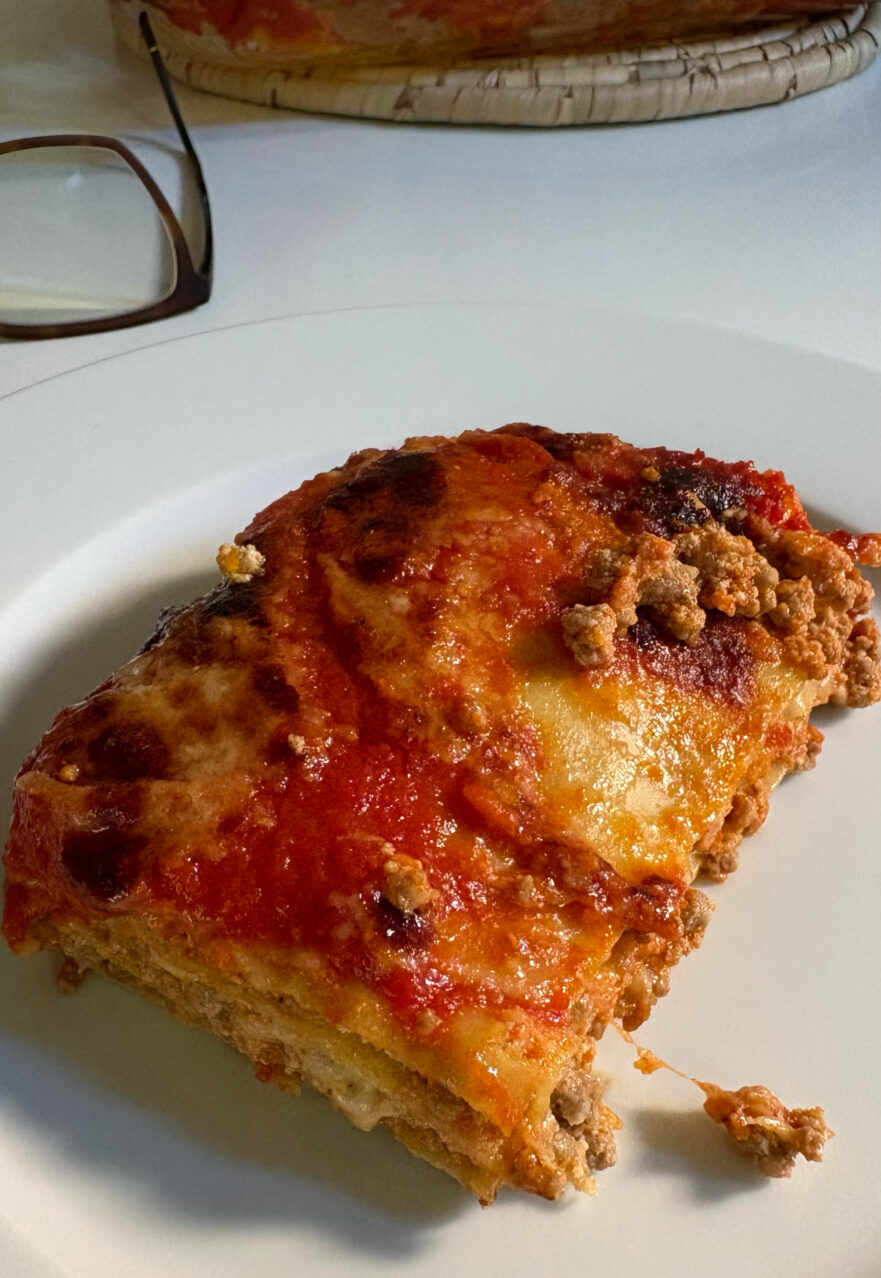 Simplement es prepara una salsa de tomàquet molt líquida, es cou la carn picada a banda i es barreja amb la ricotta, i es fan les capes afegint-hi formatge emmental ratllat. El parmesà, al final.
