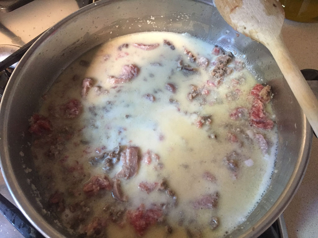 Coeu la ceba i quan la llet s’evapori casi del tot afegiu-hi una segona tassa de llet. Quan també aquest hagi evaporat, afegiu-hi la botifarra i una tercera tassa de llet. Ajusteu de sal, afegiu-hi pebre i nou moscada. Quan la llet evapora casi del tot, afegiu-hi la quarta tassa i coeu-ho fins que quedi així: