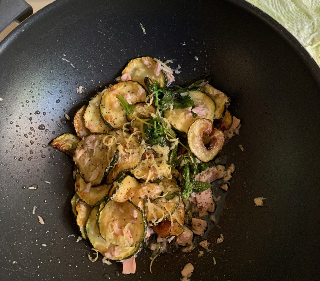 Espereu un parell de minut i afegiu-hi els carbassons fregits (en podeu guardar un parell de rodanxes per decorar el plat), la tonyina ben escorreguda i esmicolada, el suc de mitja llimona, la pell ratllada de la llimona, sal i pebre.