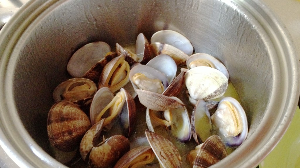 Quan la carbassa està casi al punt, incorporeu-hi les cloïsses, retireu el julivert, coeu-ho per un parell de minuts més i apagueu el foc.