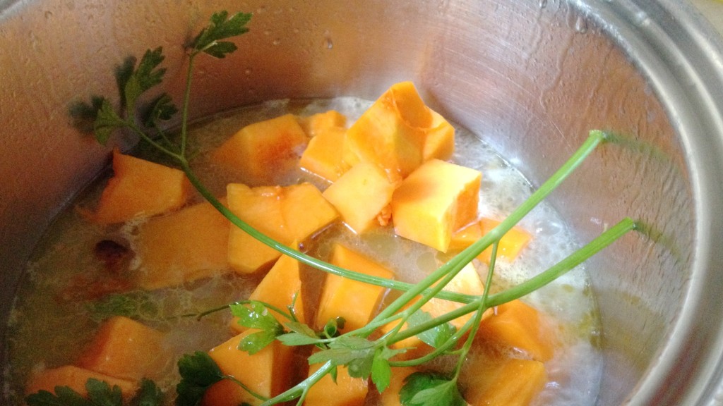 Torneu a encendre el foc i quan arrenqui el bull afegiu-hi la carbasses tallada a trossos i 4-5 branques de julivert senceres. Tapeu i coeu la carbassa a foc mitjà fins que estigui molt tendra. Si el suquet de les cloïsses no fos suficient perquè la carbassa es cogui, afegiu-hi una mica de vi blanc.